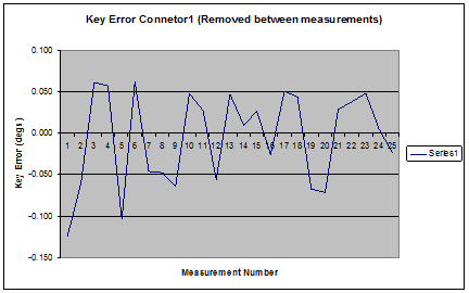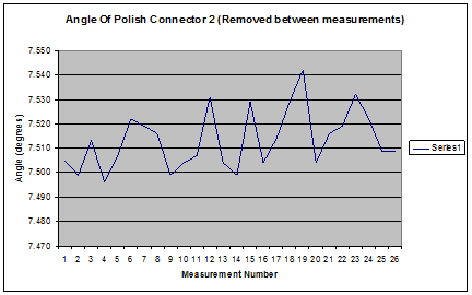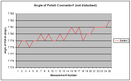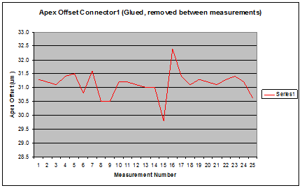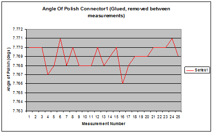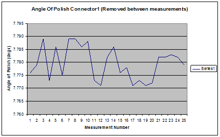 The purpose of this paper is to raise awareness and to encourage discussion on the sources of poor repeatability of apex offset in APC connectors. A measurement system has to be repeatable in order for any calibration using known artifacts to have any value. Apex offset is a combination of angle of the polish and error in the key. To determine where the variability lies it is beneficial to look at these 2 components of apex offset separately. The two sources of measurement variation are the part under test and the equipment used to make those tests. Possible variability on the equipment leading to poor apex repeatability could be the tolerance in the plate used to key the connector and any wear on the fixture holding the ferrule. Possible variability due to the part would be tolerance on the key width (the study used FC/APC with narrow keys) and the degree of freedom between the back hub of the ferrule and the FC/APC housing resulting in a small ferrule rotation that can change the apex offset of an APC connector. The apex offset position is set during the polishing process. Generally speaking, ferrules have a chamfer around the endface that is symmetric with the axis of the ferrule. However, when polished at 8 degrees, the apex of the polished area changes with respect to the fiber core. As more material is removed during polishing, the surface of the endface becomes relatively larger on one side, moving the center of the ferrule endface to one side and away from the ferrule axis. All APC connectors are designed to enable the ferrule to float within the connector housing. This float is necessary because the ferrule is spring-loaded towards the front of the connector to ensure proper mating. The down side is that the float can allow the ferrule to rotate about the axis of the ferrule and with respect to the connector key. Even the smallest rotation can lead to a change in apex offset. The ferrule rotation within the connector can occur by simply cleaning the connector or by the act of simply removing a dust cap. The following series of graphs show repeatability studies for the following conditions. 1 Connector1 not moved – Baseline for Interferometer repeatability 2 Connector1 removed and re-inserted – Combination of tolerances of key width on connector, repeatability of fixture holding the ferrule and degrees of rotation between the ferrule and outer key. 3 Connector1 glued in position to eliminate internal rotation of ferrule relative to key, the connector was removed and re-inserted between measurements – Combination of tolerance of the key on the connector and the key width of the adapter plate plus repeatability of fixture holding the ferrule. 4 Connector2 from different manufacturer removed and inserted between measurements. Connector1 Not Moved During Measurements